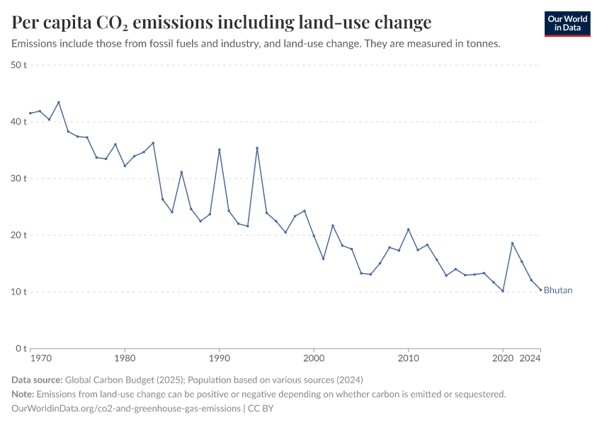 “Data Page: Per capita CO₂ emissions including land-use change”, part of the following publication: Hannah Ritchie, Pablo Rosado, and Max Roser (2023) - “CO₂ and Greenhouse Gas Emissions”. Data adapted from Global Carbon Project, Various sources. Retrieved from https://archive.ourworldindata.org/20251204-133459/grapher/per-capita-co2-including-land.html [online resource] (archived on December 4, 2025).