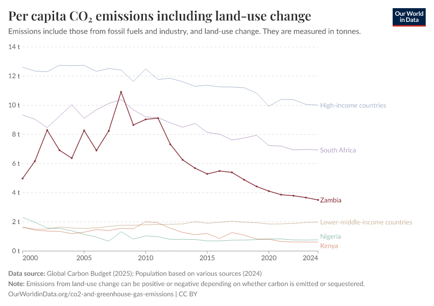 “Data Page: Per capita CO₂ emissions including land-use change”, part of the following publication: Hannah Ritchie, Pablo Rosado, and Max Roser (2023) - “CO₂ and Greenhouse Gas Emissions”. Data adapted from Global Carbon Project, Various sources. Retrieved from https://archive.ourworldindata.org/20260119-070102/grapher/per-capita-co2-including-land.html [online resource] (archived on January 19, 2026).How to cite this data