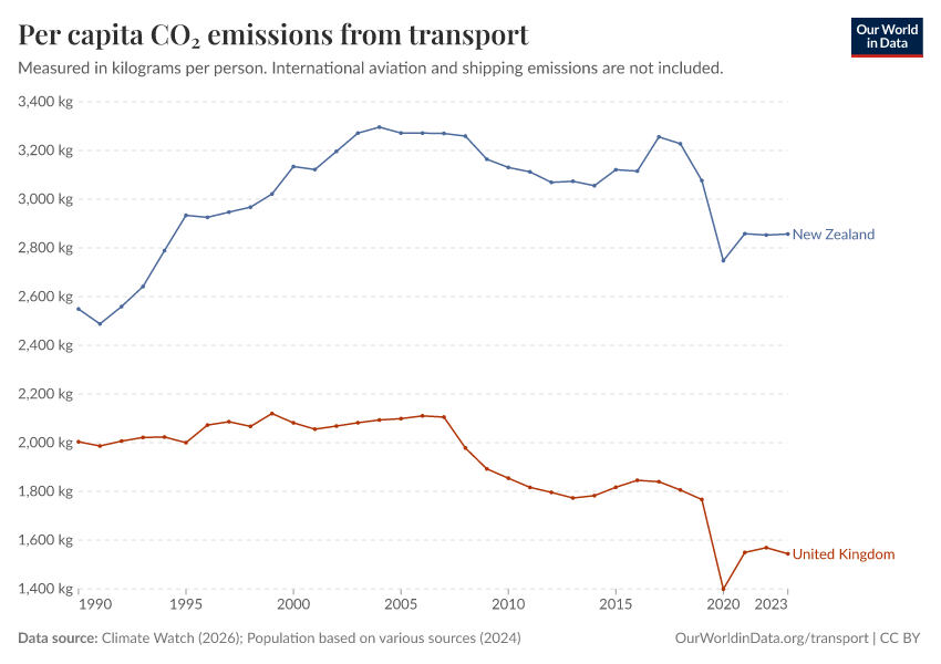 “Data Page: Per capita CO₂ emissions from transport”, part of the following publication: Hannah Ritchie, Pablo Rosado, and Max Roser (2023) - “CO₂ and Greenhouse Gas Emissions”. Data adapted from Climate Watch, Various sources. Retrieved from https://archive.ourworldindata.org/20260305-161147/grapher/per-capita-co2-transport.html [online resource] (archived on March 5, 2026).How to cite this data