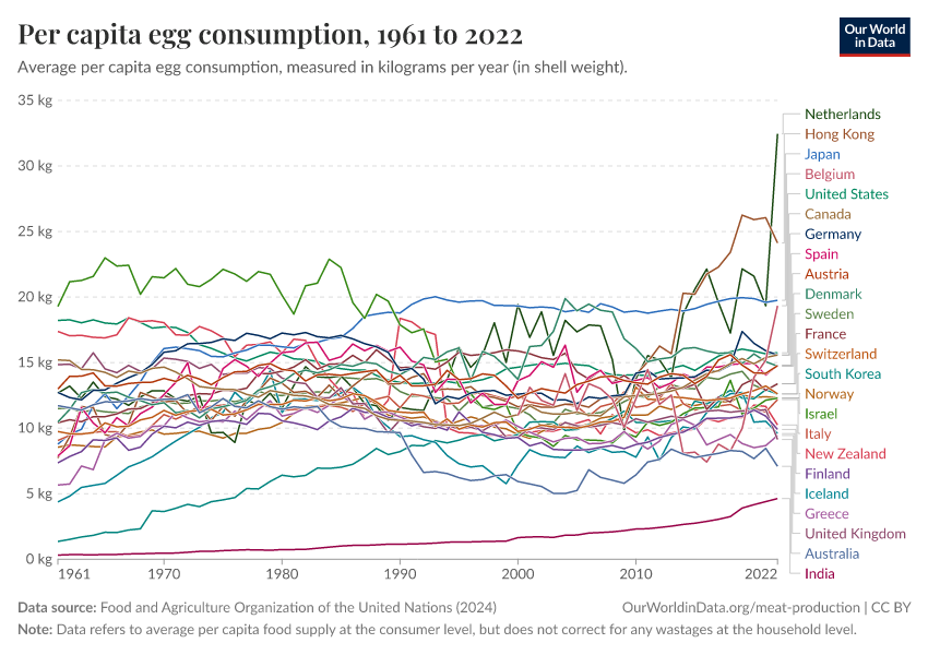 “Data Page: Yearly per capita supply of eggs”. Our World in Data (2026). Data adapted from Food and Agriculture Organization of the United Nations. Retrieved from https://archive.ourworldindata.org/20251128-120039/grapher/per-capita-egg-consumption-kilograms-per-year.html [online resource] (archived on November 28, 2025).