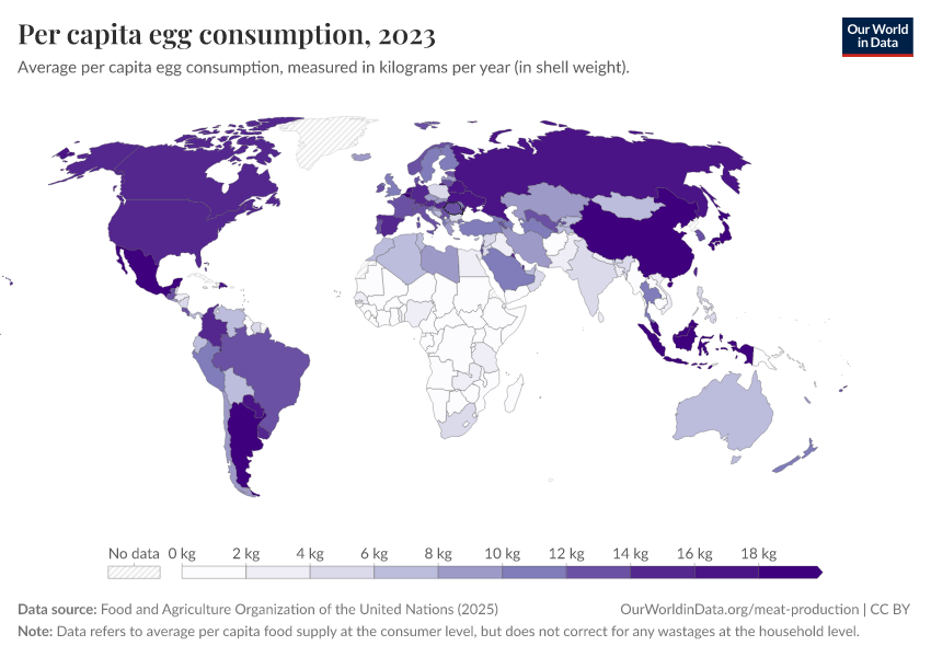 “Data Page: Yearly per capita supply of eggs”. Our World in Data (2026). Data adapted from Food and Agriculture Organization of the United Nations. Retrieved from https://archive.ourworldindata.org/20260410-215714/grapher/per-capita-egg-consumption-kilograms-per-year.html [online resource] (archived on April 10, 2026).How to cite this data