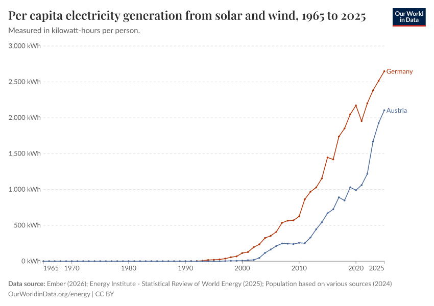 “Data Page: Electricity generation from solar and wind power per person”, part of the following publication: Hannah Ritchie, Pablo Rosado, and Max Roser (2023) - “Energy”. Data adapted from Ember, Energy Institute, Various sources. Retrieved from https://archive.ourworldindata.org/20260402-173937/grapher/per-capita-electricity-generation-from-solar-and-wind.html [online resource] (archived on April 2, 2026).How to cite this data