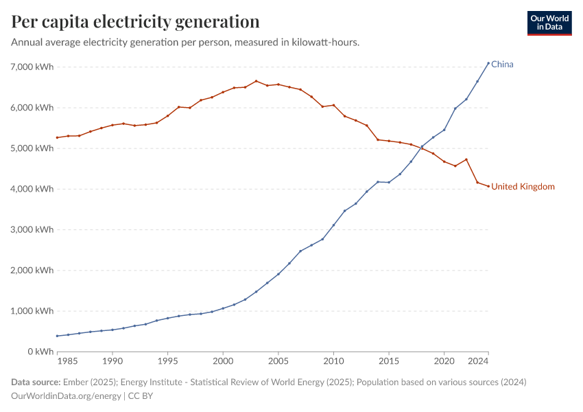 Ember (2025); Energy Institute - Statistical Review of World Energy (2025); Population based on various sources (2024) – with major processing by Our World in Data. “Total electricity generation per person” [dataset]. Ember, “Yearly Electricity Data Europe”; Ember, “Yearly Electricity Data”; Energy Institute, “Statistical Review of World Energy”; Various sources, “Population” [original data]. Retrieved December 7, 2025 from https://archive.ourworldindata.org/20250925-233948/grapher/per-capita-electricity-generation.html (archived on September 25, 2025).