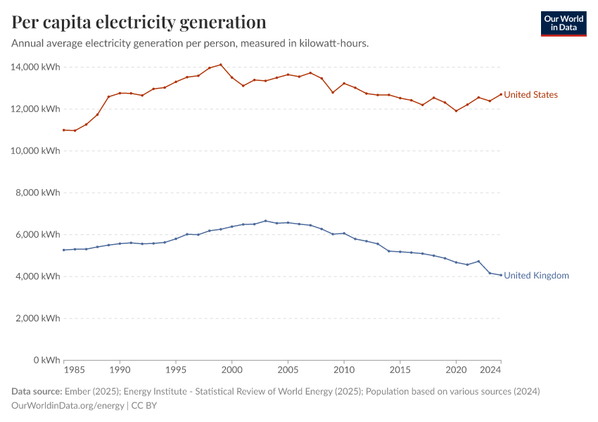 Ember (2025); Energy Institute - Statistical Review of World Energy (2025); Population based on various sources (2024) – with major processing by Our World in Data. “Total electricity generation per person” [dataset]. Ember, “Yearly Electricity Data Europe”; Ember, “Yearly Electricity Data”; Energy Institute, “Statistical Review of World Energy”; Various sources, “Population” [original data]. Retrieved December 19, 2025 from https://archive.ourworldindata.org/20250925-233948/grapher/per-capita-electricity-generation.html (archived on September 25, 2025).