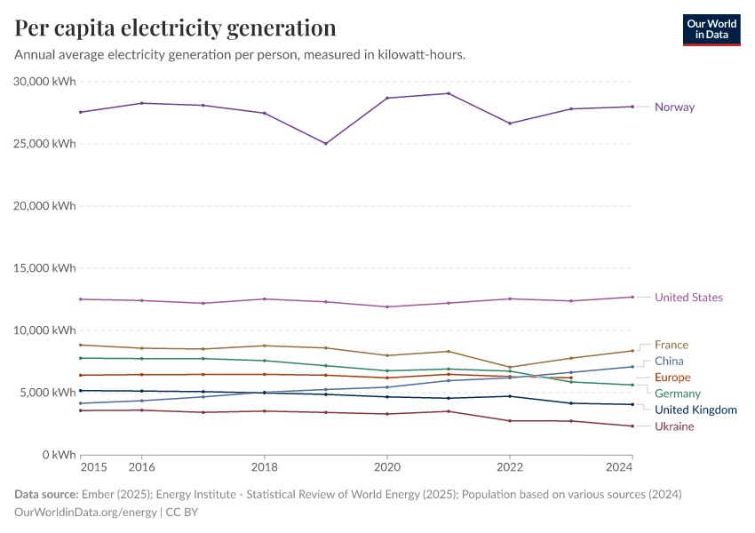 Ember (2025); Energy Institute - Statistical Review of World Energy (2025); Population based on various sources (2024) – with major processing by Our World in Data. “Total electricity generation per person” [dataset]. Ember, “Yearly Electricity Data Europe”; Ember, “Yearly Electricity Data”; Energy Institute, “Statistical Review of World Energy”; Various sources, “Population” [original data]. Retrieved December 21, 2025 from https://archive.ourworldindata.org/20250925-233948/grapher/per-capita-electricity-generation.html (archived on September 25, 2025).