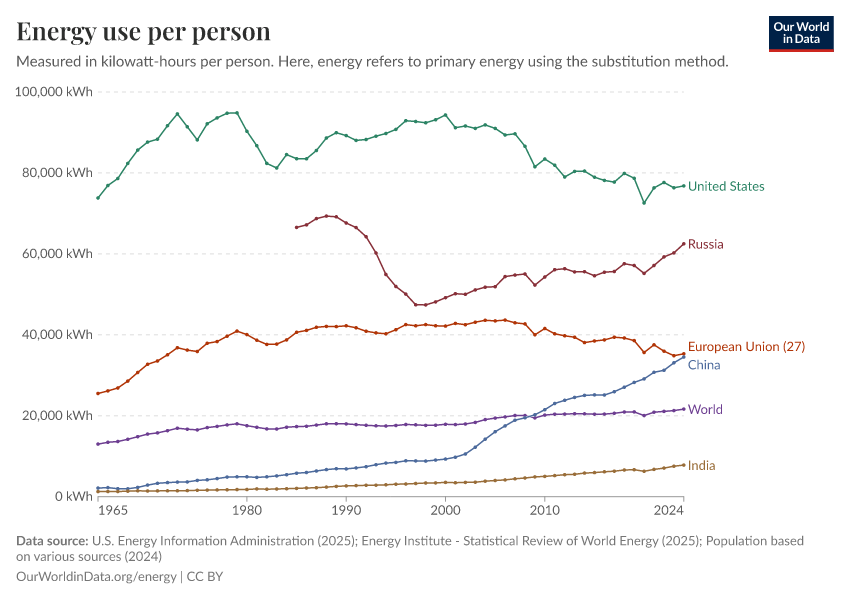 U.S. Energy Information Administration (2025); Energy Institute - Statistical Review of World Energy (2025); Population based on various sources (2024) – with major processing by Our World in Data. “Primary energy consumption per capita” [dataset]. U.S. Energy Information Administration, “International Energy Data”; Energy Institute, “Statistical Review of World Energy”; Various sources, “Population” [original data]. Retrieved January 14, 2026 from https://archive.ourworldindata.org/20250925-233948/grapher/per-capita-energy-use.html (archived on September 25, 2025).