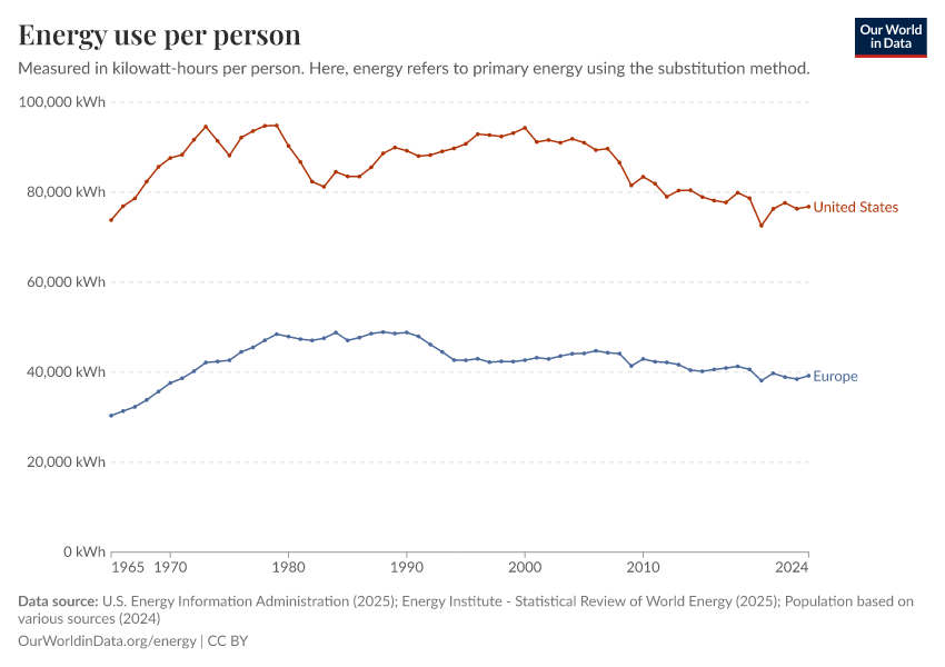 U.S. Energy Information Administration (2025); Energy Institute - Statistical Review of World Energy (2025); Population based on various sources (2024) – with major processing by Our World in Data. “Primary energy consumption per capita” [dataset]. U.S. Energy Information Administration, “International Energy Data”; Energy Institute, “Statistical Review of World Energy”; Various sources, “Population” [original data]. Retrieved April 5, 2026 from https://archive.ourworldindata.org/20260402-164039/grapher/per-capita-energy-use.html (archived on April 2, 2026).Download