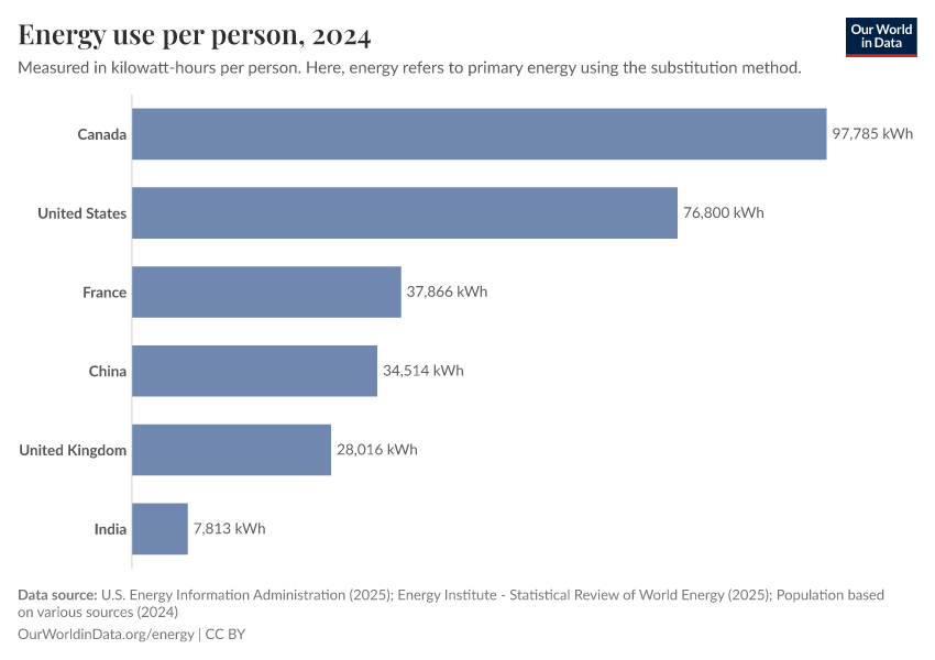“Data Page: Primary energy consumption per capita”, part of the following publication: Hannah Ritchie, Pablo Rosado, and Max Roser (2023) - “Energy”. Data adapted from U.S. Energy Information Administration, Energy Institute, Various sources. Retrieved from https://archive.ourworldindata.org/20260119-065148/grapher/per-capita-energy-use.html [online resource] (archived on January 19, 2026).How to cite this data