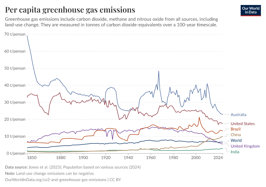 Jones et al. (2025); Population based on various sources (2024) – with major processing by Our World in Data. “Per capita greenhouse gas emissions including land use” [dataset]. Jones et al., “National contributions to climate change 2025.1”; Various sources, “Population” [original data]. Retrieved December 11, 2025 from https://archive.ourworldindata.org/20251204-133820/grapher/per-capita-ghg-emissions.html (archived on December 4, 2025).