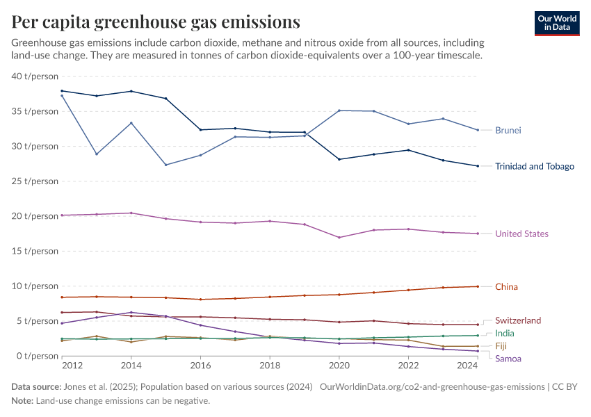 Jones et al. (2025); Population based on various sources (2024) – with major processing by Our World in Data. “Per capita greenhouse gas emissions including land use” [dataset]. Jones et al., “National contributions to climate change 2025.1”; Various sources, “Population” [original data]. Retrieved April 1, 2026 from https://archive.ourworldindata.org/20260304-094028/grapher/per-capita-ghg-emissions.html (archived on March 4, 2026).