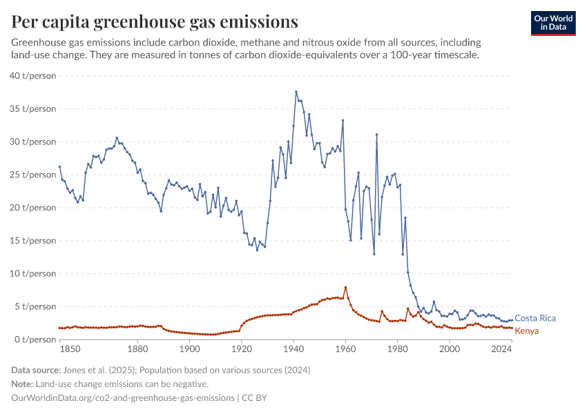 Jones et al. (2025); Population based on various sources (2024) – with major processing by Our World in Data. “Per capita greenhouse gas emissions including land use” [dataset]. Jones et al., “National contributions to climate change 2025.1”; Various sources, “Population” [original data]. Retrieved December 8, 2025 from https://archive.ourworldindata.org/20251204-133820/grapher/per-capita-ghg-emissions.html (archived on December 4, 2025).