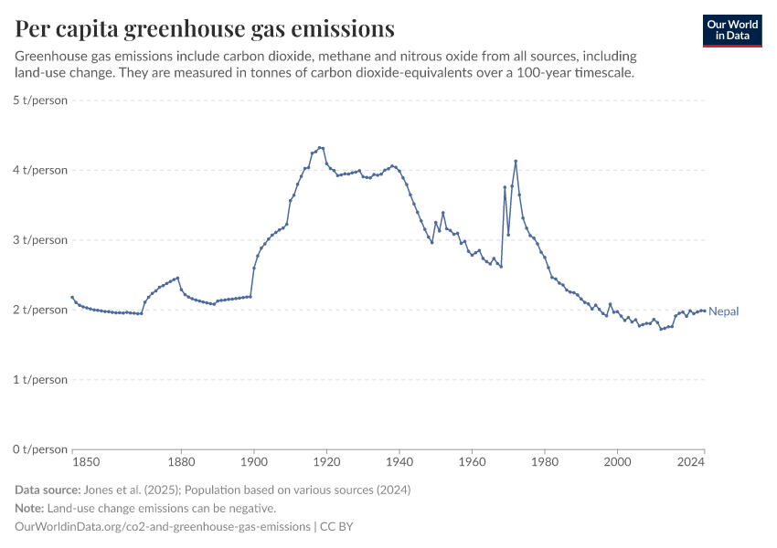 “Data Page: Per capita greenhouse gas emissions including land use”, part of the following publication: Hannah Ritchie, Pablo Rosado, and Max Roser (2023) - “CO₂ and Greenhouse Gas Emissions”. Data adapted from Jones et al., Various sources. Retrieved from https://archive.ourworldindata.org/20251204-133820/grapher/per-capita-ghg-emissions.html [online resource] (archived on December 4, 2025).How to cite this data