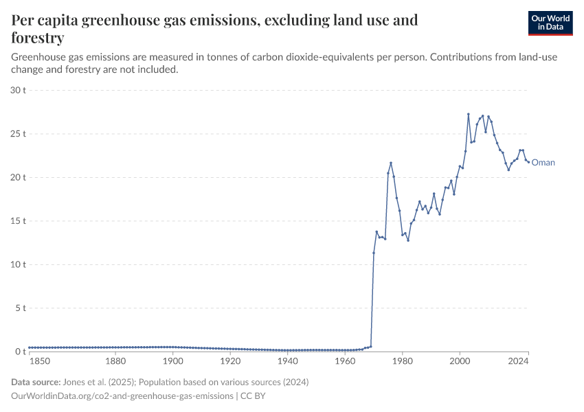 “Data Page: Per capita greenhouse gas emissions from fossil fuels and industry”, part of the following publication: Hannah Ritchie, Pablo Rosado, and Max Roser (2023) - “CO₂ and Greenhouse Gas Emissions”. Data adapted from Jones et al., Various sources. Retrieved from https://archive.ourworldindata.org/20251204-133820/grapher/per-capita-ghg-excl-land-use.html [online resource] (archived on December 4, 2025).How to cite this data