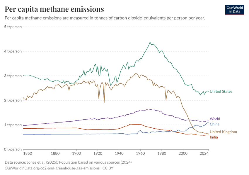 “Data Page: Per capita methane emissions including land use”, part of the following publication: Hannah Ritchie, Pablo Rosado, and Max Roser (2023) - “CO₂ and Greenhouse Gas Emissions”. Data adapted from Jones et al., Various sources. Retrieved from https://archive.ourworldindata.org/20251204-133820/grapher/per-capita-methane-emissions.html [online resource] (archived on December 4, 2025).How to cite this data