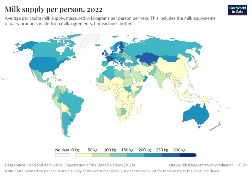 “Data Page: Yearly per capita supply of milk - excluding butter”. Our World in Data (2025). Data adapted from Food and Agriculture Organization of the United Nations. Retrieved from https://archive.ourworldindata.org/20251128-120039/grapher/per-capita-milk-consumption.html [online resource] (archived on November 28, 2025).How to cite this data
