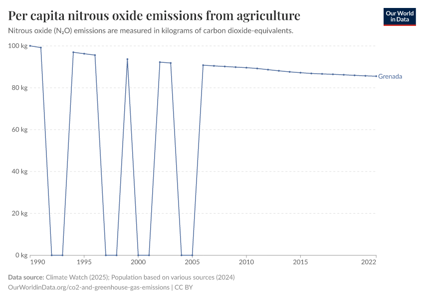 “Data Page: Per capita nitrous oxide emissions from agriculture”, part of the following publication: Hannah Ritchie, Pablo Rosado, and Max Roser (2023) - “CO₂ and Greenhouse Gas Emissions”. Data adapted from Climate Watch, Various sources. Retrieved from https://archive.ourworldindata.org/20250925-233948/grapher/per-capita-nitrous-oxide-agriculture.html [online resource] (archived on September 25, 2025).