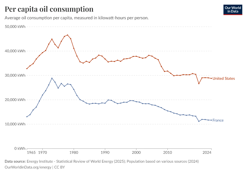 Energy Institute - Statistical Review of World Energy (2025); Population based on various sources (2024) – with major processing by Our World in Data. “Oil consumption per capita” [dataset]. Energy Institute, “Statistical Review of World Energy”; Various sources, “Population” [original data]. Retrieved April 5, 2026 from https://archive.ourworldindata.org/20260402-164039/grapher/per-capita-oil.html (archived on April 2, 2026).Download