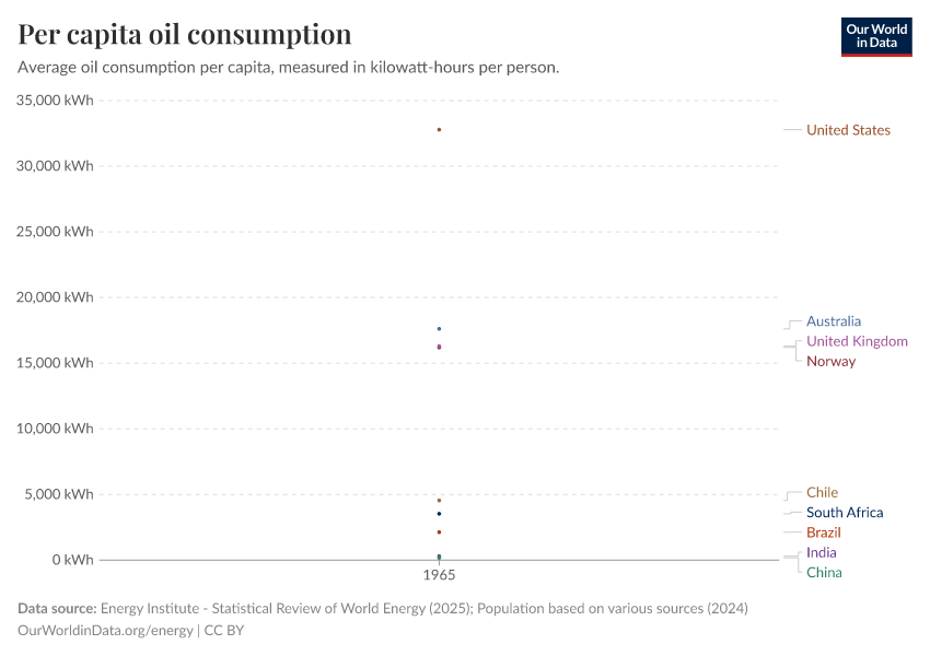Energy Institute - Statistical Review of World Energy (2025); Population based on various sources (2024) – with major processing by Our World in Data. “Oil consumption per capita” [dataset]. Energy Institute, “Statistical Review of World Energy”; Various sources, “Population” [original data]. Retrieved January 1, 2026 from https://archive.ourworldindata.org/20250925-233948/grapher/per-capita-oil.html (archived on September 25, 2025).