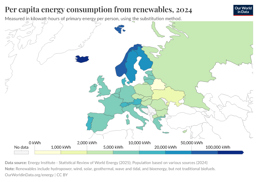 Energy Institute - Statistical Review of World Energy (2025); Population based on various sources (2024) – with major processing by Our World in Data. “Renewables consumption per capita – Using the substitution method” [dataset]. Energy Institute, “Statistical Review of World Energy”; Various sources, “Population” [original data]. Retrieved December 7, 2025 from https://archive.ourworldindata.org/20250925-233948/grapher/per-capita-renewables.html (archived on September 25, 2025).