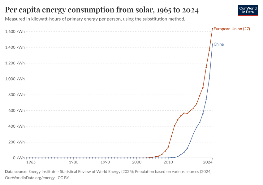 Energy Institute - Statistical Review of World Energy (2025); Population based on various sources (2024) – with major processing by Our World in Data. “Solar power consumption per capita – Using the substitution method” [dataset]. Energy Institute, “Statistical Review of World Energy”; Various sources, “Population” [original data]. Retrieved April 3, 2026 from https://archive.ourworldindata.org/20260402-164039/grapher/per-capita-solar.html (archived on April 2, 2026).Download