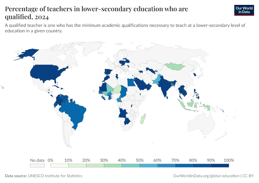 “Data Page: Percentage of teachers in lower-secondary education who are qualified”. Our World in Data (2025). Data adapted from UNESCO Institute for Statistics. Retrieved from https://archive.ourworldindata.org/20251125-165536/grapher/percentage-of-teachers-in-lower-secondary-education-who-are-qualified.html [online resource] (archived on November 25, 2025).How to cite this data