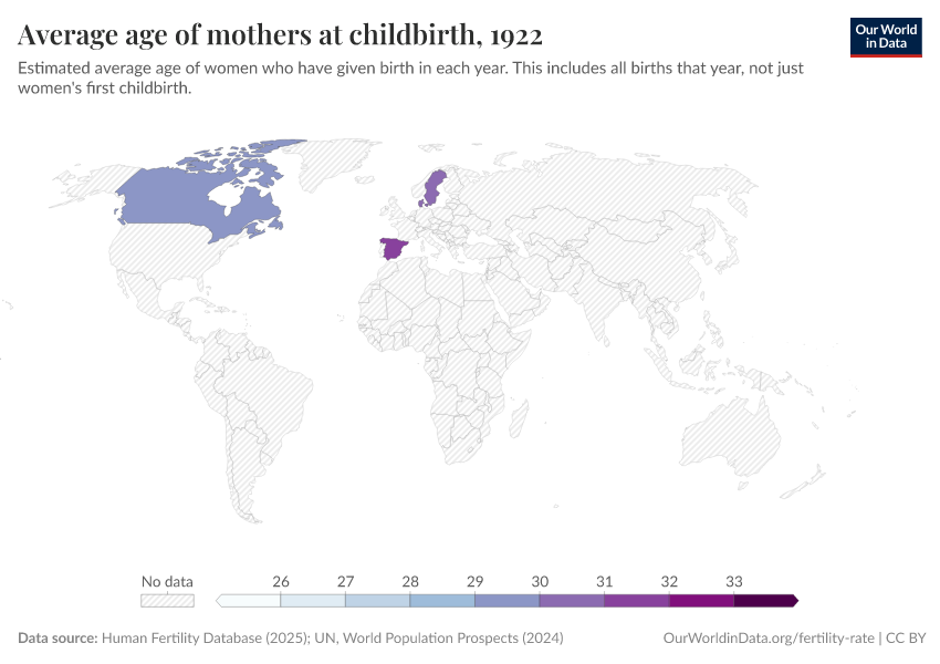 “Data Page: Mean age at childbearing”, part of the following publication: Saloni Dattani, Lucas Rodés-Guirao, and Max Roser (2025) - “Fertility Rate”. Data adapted from Human Fertility Database, United Nations. Retrieved from https://archive.ourworldindata.org/20251022-230420/grapher/period-average-age-of-mothers.html [online resource] (archived on October 22, 2025).