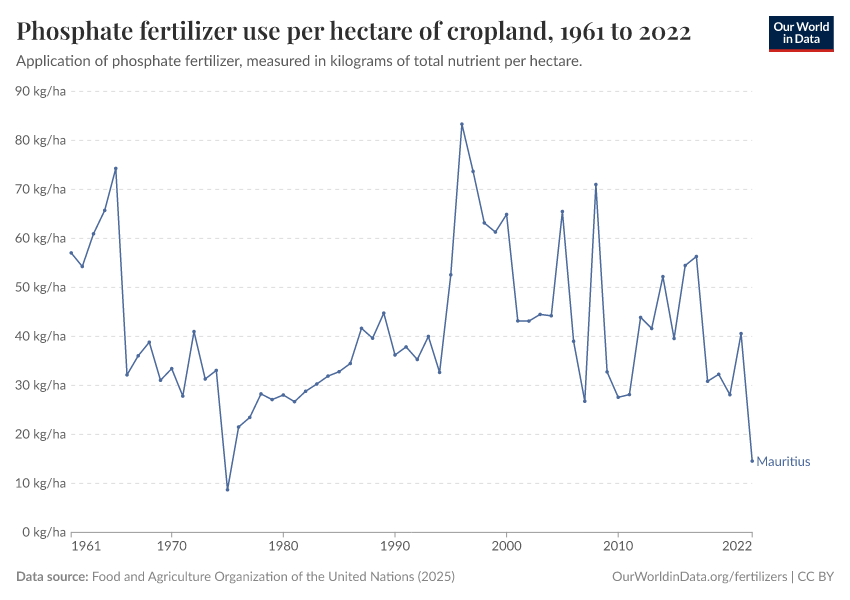 Food and Agriculture Organization of the United Nations (2025) – with major processing by Our World in Data. “Phosphate fertilizer use per area of cropland – UN FAO” [dataset]. Food and Agriculture Organization of the United Nations, “Land, Inputs and Sustainability: Fertilizers by Nutrient” [original data]. Retrieved December 5, 2025 from https://archive.ourworldindata.org/20251014-161652/grapher/phosphate-application-per-hectare-of-cropland.html (archived on October 14, 2025).