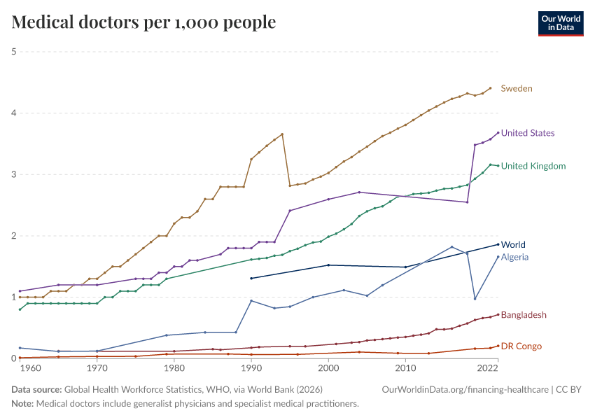 “Data Page: Medical doctors per 1,000 people”. Our World in Data (2026). Data adapted from Global Health Workforce Statistics, WHO, via World Bank. Retrieved from https://archive.ourworldindata.org/20260202-181317/grapher/physicians-per-1000-people.html [online resource] (archived on February 2, 2026).How to cite this data