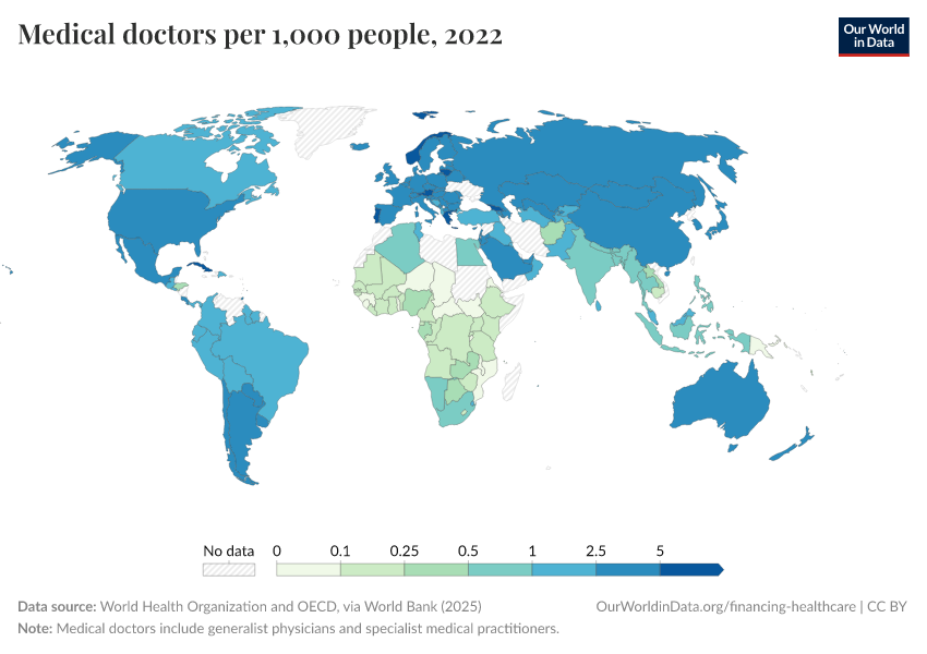 “Data Page: Medical doctors per 1,000 people”. Our World in Data (2025). Data adapted from World Health Organization and OECD, via World Bank. Retrieved from https://archive.ourworldindata.org/20250916-102301/grapher/physicians-per-1000-people.html [online resource] (archived on September 16, 2025).How to cite this data