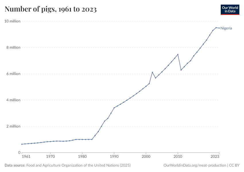 Food and Agriculture Organization of the United Nations (2025) – with major processing by Our World in Data. “Number of pigs – UN FAO” [dataset]. Food and Agriculture Organization of the United Nations, “Production: Crops and livestock products” [original data]. Retrieved December 6, 2025 from https://archive.ourworldindata.org/20251014-161652/grapher/pig-livestock-count-heads.html (archived on October 14, 2025).