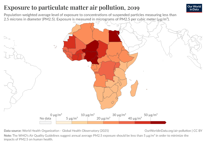 “Data Page: Exposure to particulate matter air pollution”. Our World in Data (2026). Data adapted from World Health Organization. Retrieved from https://archive.ourworldindata.org/20250909-093708/grapher/pm25-air-pollution.html [online resource] (archived on September 9, 2025).