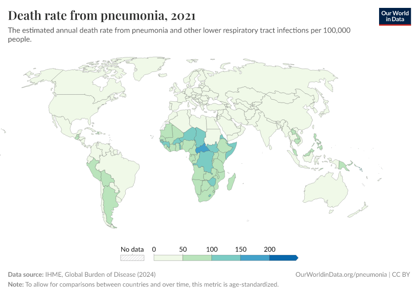 IHME, Global Burden of Disease (2024) – with minor processing by Our World in Data. “Death rate from pneumonia” [dataset]. IHME, Global Burden of Disease, “Global Burden of Disease - Deaths and DALYs” [original data]. Retrieved December 8, 2025 from https://archive.ourworldindata.org/20250909-093708/grapher/pneumonia-death-rates-age-standardized.html (archived on September 9, 2025).