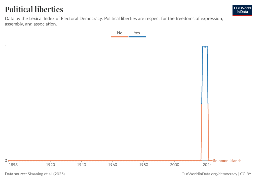 “Data Page: Political liberties”, part of the following publication: Bastian Herre, Lucas Rodés-Guirao, and Esteban Ortiz-Ospina (2013) - “Democracy”. Data adapted from Skaaning et al.. Retrieved from https://archive.ourworldindata.org/20250909-093708/grapher/political-liberties-lexical.html [online resource] (archived on September 9, 2025).How to cite this data