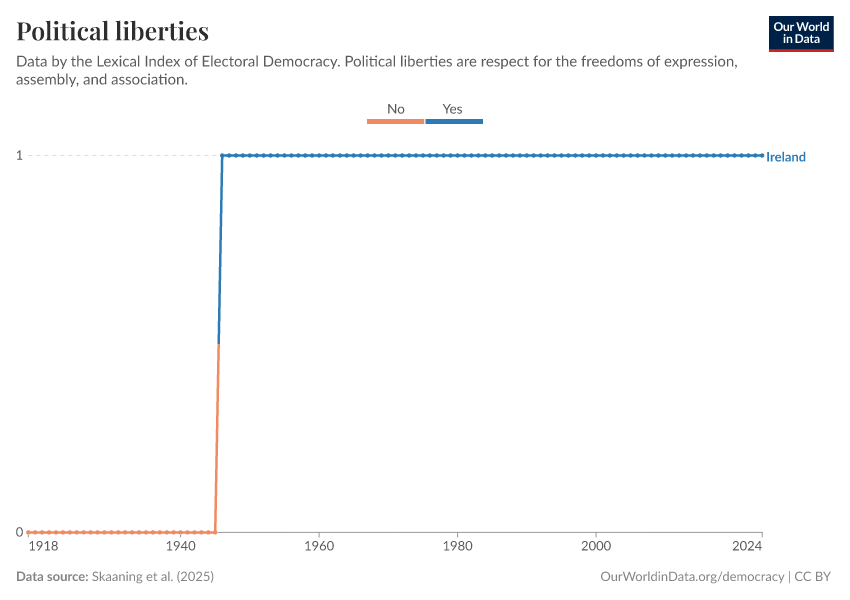 Skaaning et al. (2025) – processed by Our World in Data. “Political liberties” [dataset]. Skaaning et al., “Lexical Index of Electoral Democracy (LIED) v6.8” [original data]. Retrieved November 14, 2025 from https://archive.ourworldindata.org/20250909-093708/grapher/political-liberties-lexical.html (archived on September 9, 2025).
