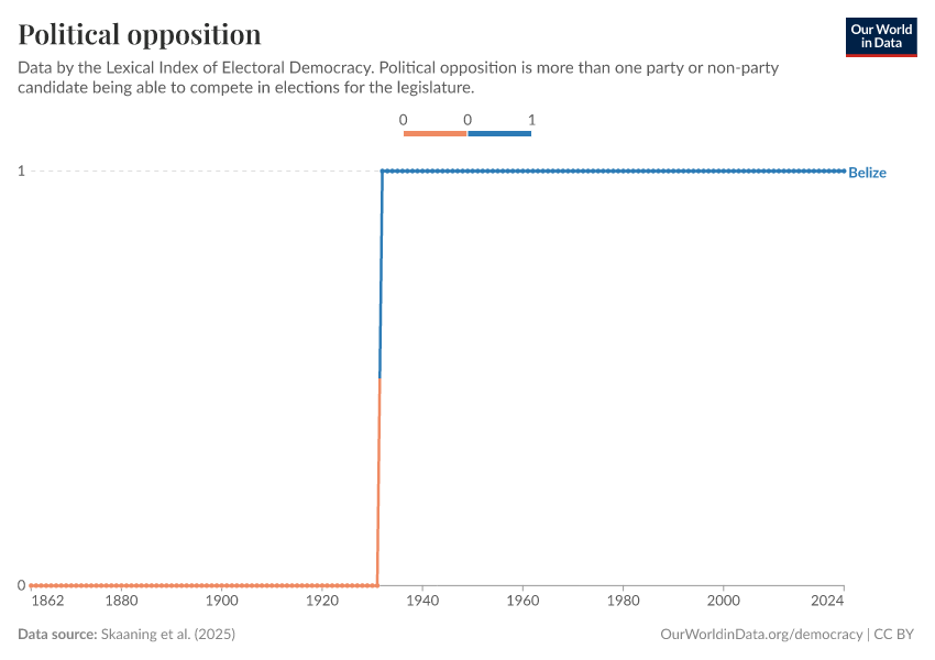 Skaaning et al. (2025) – processed by Our World in Data. “Political opposition” [dataset]. Skaaning et al., “Lexical Index of Electoral Democracy (LIED) v6.8” [original data]. Retrieved January 2, 2026 from https://archive.ourworldindata.org/20250909-093708/grapher/political-opposition-lexical.html (archived on September 9, 2025).