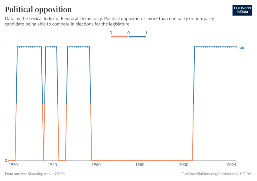 “Data Page: Political opposition”, part of the following publication: Bastian Herre, Lucas Rodés-Guirao, and Esteban Ortiz-Ospina (2013) - “Democracy”. Data adapted from Skaaning et al.. Retrieved from https://archive.ourworldindata.org/20250909-093708/grapher/political-opposition-lexical.html [online resource] (archived on September 9, 2025).
