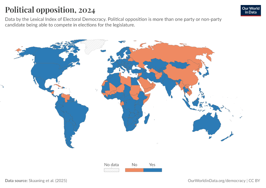 Skaaning et al. (2025) – processed by Our World in Data. “Political opposition” [dataset]. Skaaning et al., “Lexical Index of Electoral Democracy (LIED) v6.8” [original data]. Retrieved January 16, 2026 from https://archive.ourworldindata.org/20250909-093708/grapher/political-opposition-lexical.html (archived on September 9, 2025).