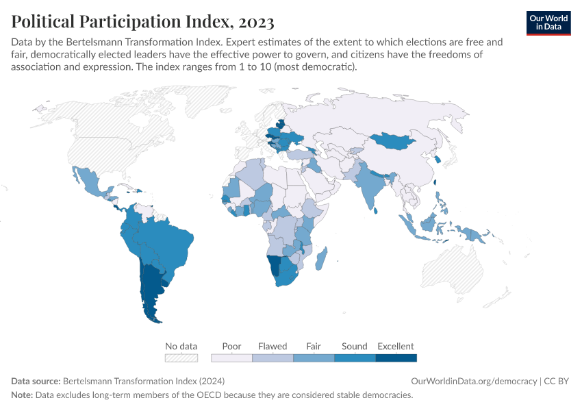 “Data Page: Political Participation Index”, part of the following publication: Bastian Herre, Lucas Rodés-Guirao, and Esteban Ortiz-Ospina (2013) - “Democracy”. Data adapted from Bertelsmann Transformation Index. Retrieved from https://archive.ourworldindata.org/20260105-133053/grapher/political-participation-index-bti.html [online resource] (archived on January 5, 2026).