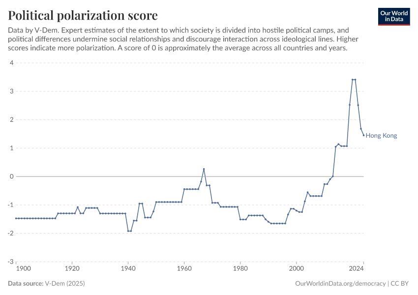“Data Page: Political polarization score”, part of the following publication: Bastian Herre, Lucas Rodés-Guirao, and Esteban Ortiz-Ospina (2013) - “Democracy”. Data adapted from V-Dem. Retrieved from https://archive.ourworldindata.org/20250925-233948/grapher/political-polarization-score.html [online resource] (archived on September 25, 2025).How to cite this data