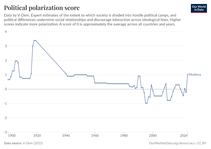 “Data Page: Political polarization score”, part of the following publication: Bastian Herre, Lucas Rodés-Guirao, and Esteban Ortiz-Ospina (2013) - “Democracy”. Data adapted from V-Dem. Retrieved from https://archive.ourworldindata.org/20250925-233948/grapher/political-polarization-score.html [online resource] (archived on September 25, 2025).How to cite this data