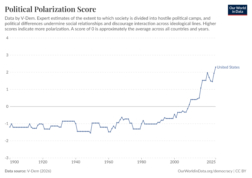 V-Dem (2026) – processed by Our World in Data. “Political polarization score – V-Dem” [dataset]. V-Dem, “Democracy report v16” [original data]. Retrieved April 23, 2026 from https://archive.ourworldindata.org/20260417-112857/grapher/political-polarization-score.html (archived on April 17, 2026).Download