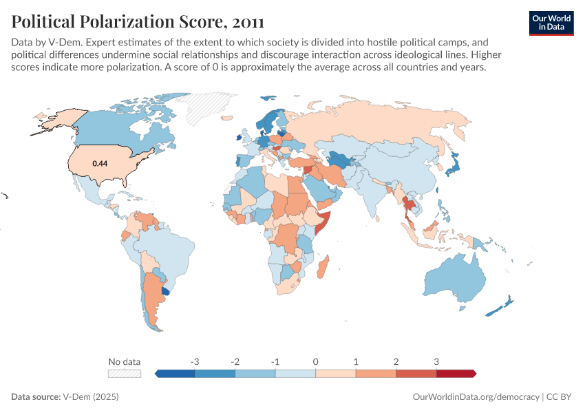“Data Page: Political polarization score”, part of the following publication: Bastian Herre, Lucas Rodés-Guirao, and Esteban Ortiz-Ospina (2013) - “Democracy”. Data adapted from V-Dem. Retrieved from https://archive.ourworldindata.org/20260304-094028/grapher/political-polarization-score.html [online resource] (archived on March 4, 2026).How to cite this data