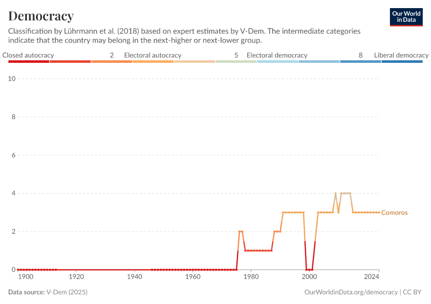 “Data Page: Political regime”, part of the following publication: Bastian Herre, Lucas Rodés-Guirao, and Esteban Ortiz-Ospina (2013) - “Democracy”. Data adapted from V-Dem. Retrieved from https://archive.ourworldindata.org/20250909-093708/grapher/political-regime-amb-row.html [online resource] (archived on September 9, 2025).How to cite this data