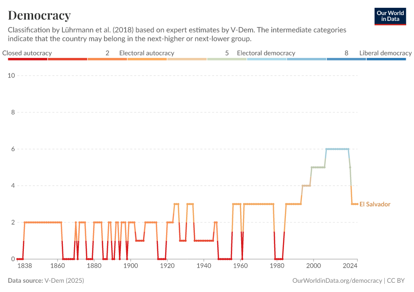 “Data Page: Political regime”, part of the following publication: Bastian Herre, Lucas Rodés-Guirao, and Esteban Ortiz-Ospina (2013) - “Democracy”. Data adapted from V-Dem. Retrieved from https://archive.ourworldindata.org/20250909-093708/grapher/political-regime-amb-row.html [online resource] (archived on September 9, 2025).How to cite this data