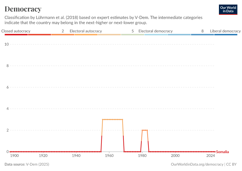 “Data Page: Political regime”, part of the following publication: Bastian Herre, Lucas Rodés-Guirao, and Esteban Ortiz-Ospina (2013) - “Democracy”. Data adapted from V-Dem. Retrieved from https://archive.ourworldindata.org/20250909-093708/grapher/political-regime-amb-row.html [online resource] (archived on September 9, 2025).How to cite this data