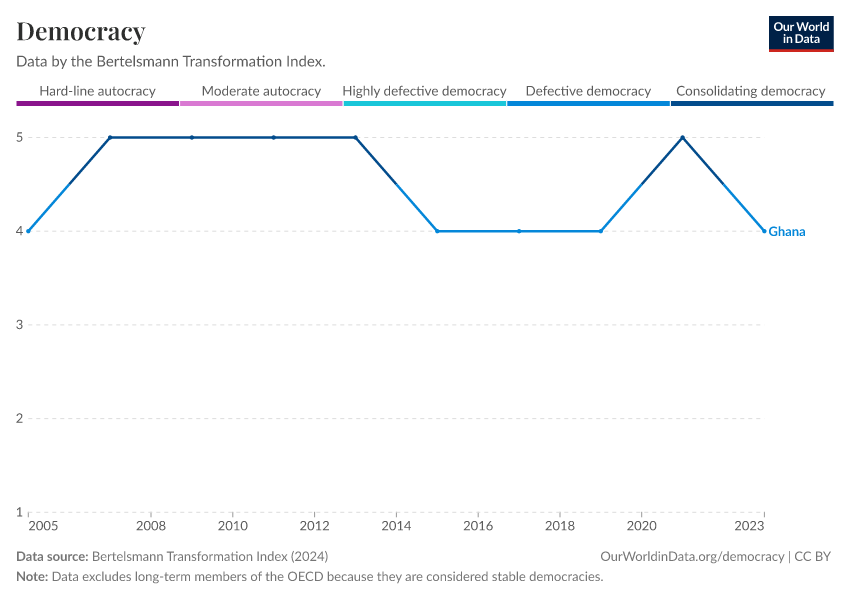 “Data Page: Democracy”, part of the following publication: Bastian Herre, Lucas Rodés-Guirao, and Esteban Ortiz-Ospina (2013) - “Democracy”. Data adapted from Bertelsmann Transformation Index. Retrieved from https://archive.ourworldindata.org/20250909-093708/grapher/political-regime-bti.html [online resource] (archived on September 9, 2025).