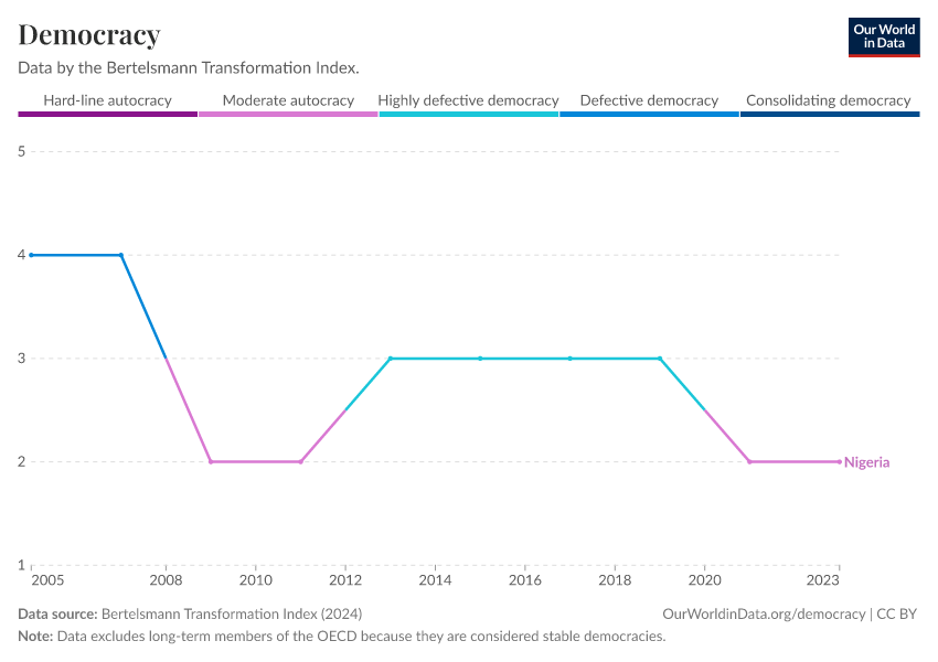 “Data Page: Democracy”, part of the following publication: Bastian Herre, Lucas Rodés-Guirao, and Esteban Ortiz-Ospina (2013) - “Democracy”. Data adapted from Bertelsmann Transformation Index. Retrieved from https://archive.ourworldindata.org/20250909-093708/grapher/political-regime-bti.html [online resource] (archived on September 9, 2025).How to cite this data