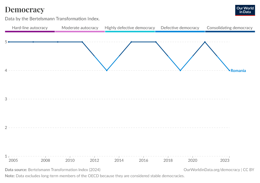 “Data Page: Democracy”, part of the following publication: Bastian Herre, Lucas Rodés-Guirao, and Esteban Ortiz-Ospina (2013) - “Democracy”. Data adapted from Bertelsmann Transformation Index. Retrieved from https://archive.ourworldindata.org/20250909-093708/grapher/political-regime-bti.html [online resource] (archived on September 9, 2025).How to cite this data