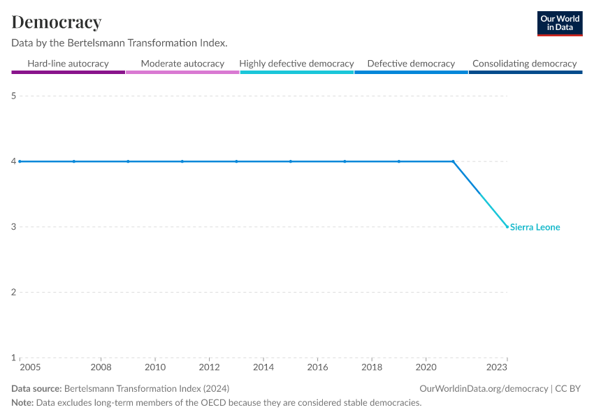 “Data Page: Democracy”, part of the following publication: Bastian Herre, Lucas Rodés-Guirao, and Esteban Ortiz-Ospina (2013) - “Democracy”. Data adapted from Bertelsmann Transformation Index. Retrieved from https://archive.ourworldindata.org/20250909-093708/grapher/political-regime-bti.html [online resource] (archived on September 9, 2025).
