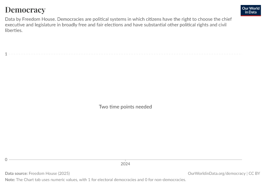 Freedom House (2025) – processed by Our World in Data. “Democracy” [dataset]. Freedom House, “Freedom in the World” [original data]. Retrieved November 15, 2025 from https://archive.ourworldindata.org/20250909-093708/grapher/political-regime-dem-fh.html (archived on September 9, 2025).